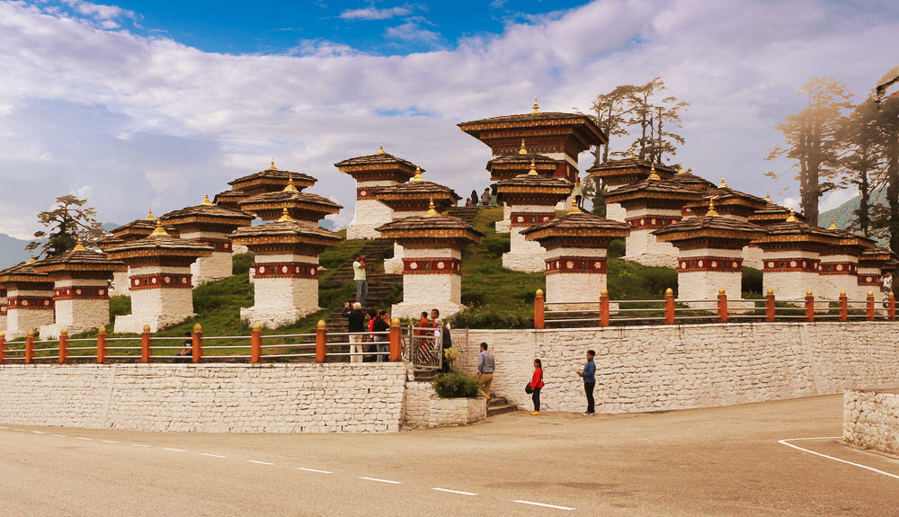 The Dochu La ( Dochu Pass, la means pass in Dzongkha) is a mountain pass in the snow covered Himalayas within Bhutan on the road from Thimpu to Punakha where 108 memorial chortens or stupas known as "Druk Wangyal Chortens" have been built by Ashi Dorji Wangmo Wangchuk, the eldest Queen Mother. Apart from the chortens there is a monastery called the Druk Wangyal Lhakhang (temple), built in honour of the fourth Druk Gyalpo (head of the state of Bhutan), Jigme Singye Wangchuck; the open grounds in its front yard is a venue for the annual Dochula Druk Wangyel Festival. The pass with 108 memorial chortens is adjacent to the country's first Royal Botanical Park.