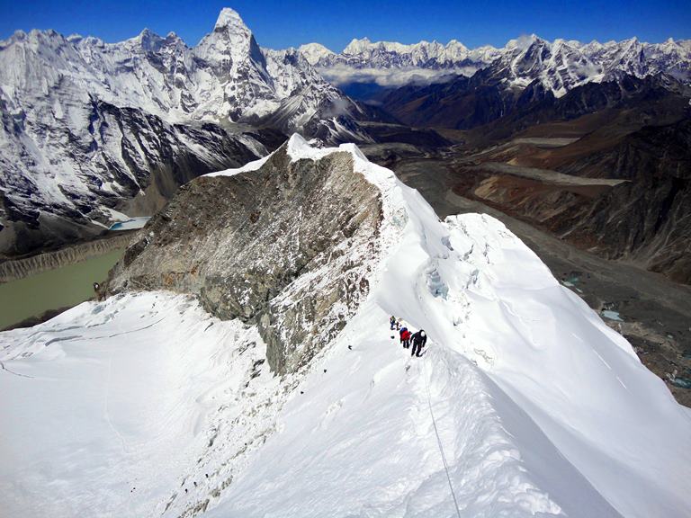 We wake up at around 1 to 2 am since we have to reach the top before noon. The trail moves up beyond the base camp for several hundred meters before striking off the steep hillside. The track has some rocky segments before we come to the narrow steep rocky channels. The narrow and rocky channels escort us to summit glacier. We rope and other required equipments to cross the glacier. A constant climb on long and steep glacier slope leads us onto the summit ridge. From the top we enjoy witnessing Lhotse, Makalu, Nuptse and Amadablam. Descend all the way to Island Peak Base Camp and celebrate the successful completion.